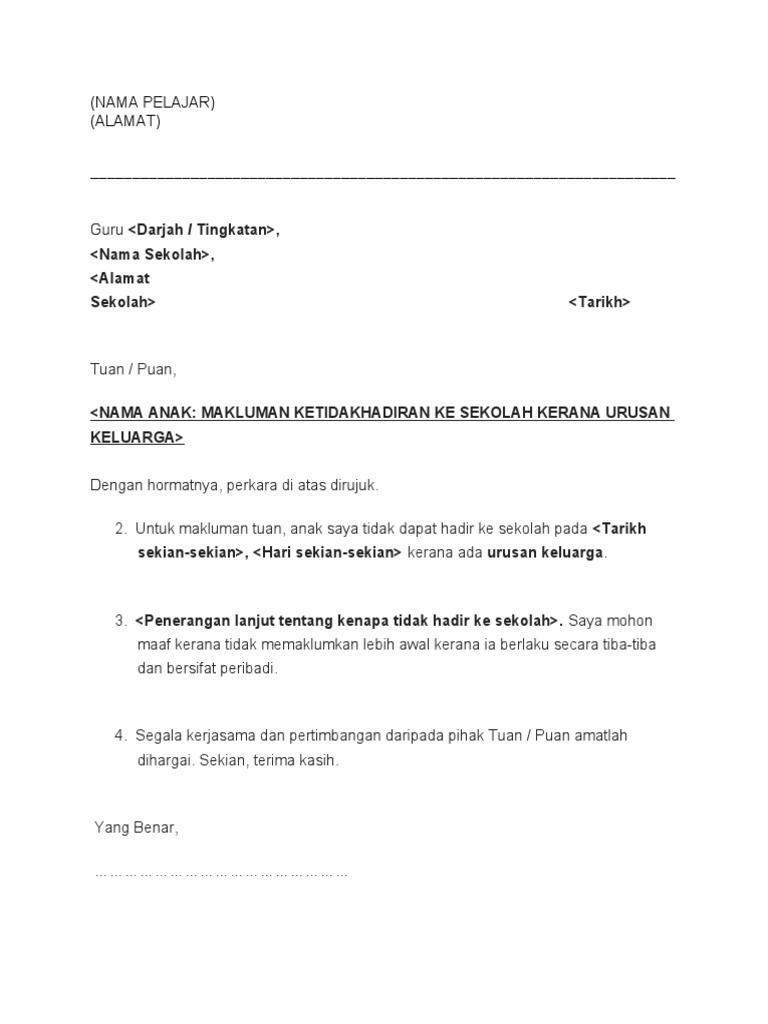 Surat Rasmi Tidak Hadir Ke Sekolah Kerana Datuk Meninggal Surat Rasmi Ra. Untuk makluman pihak tuan anak saya tidak dapat hadir ke sekolah pada tarikh bersamaan hari.